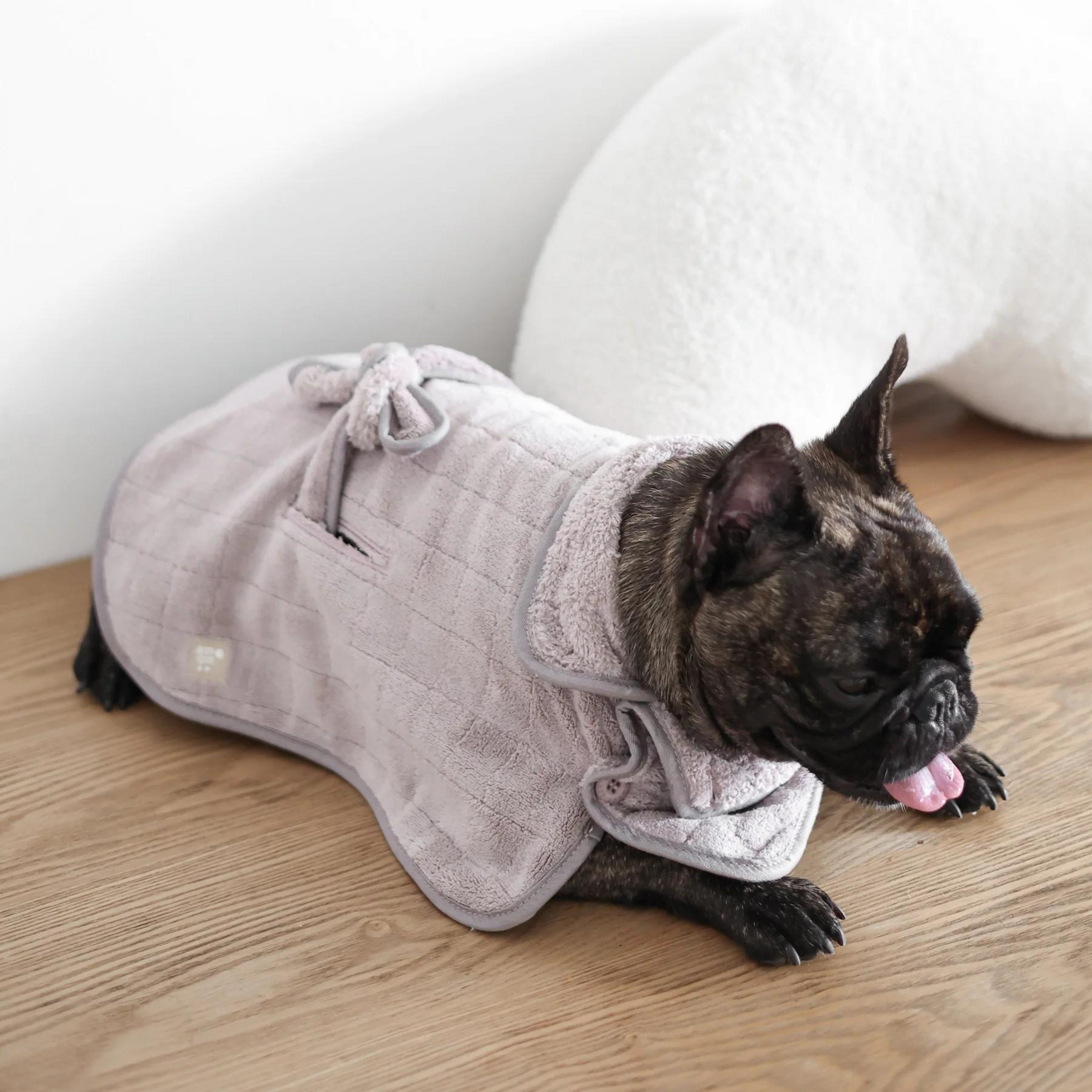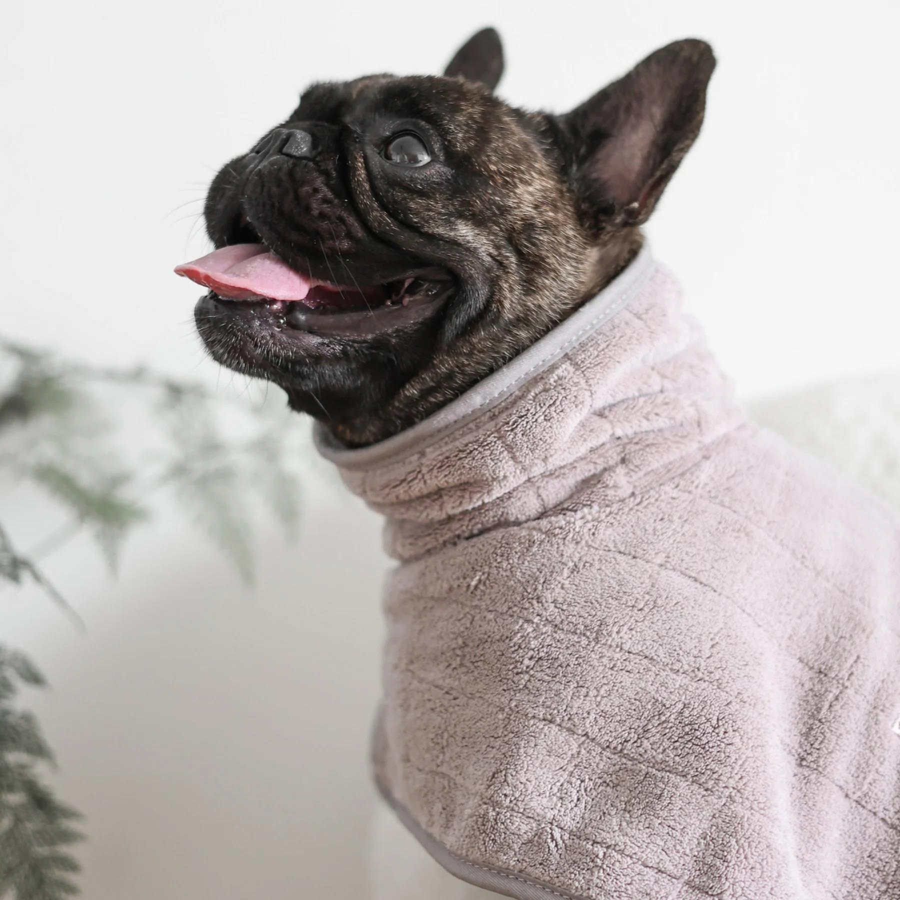 But wait, there's more! Our robe's versatile button-up or down neck design lets you cater to your pup's preferences—whether they're feeling high-collar chic or laid-back and casual. With a snug girth and secure tie-back ends, it's a snug fit every time. And fear not, our sturdy cotton binding ensures it keeps its shape, wash after wash. So go ahead, pamper your pup in style!